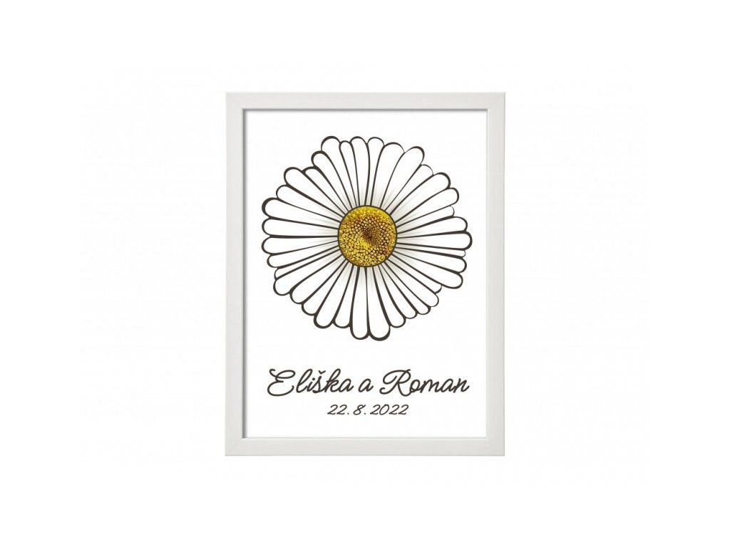 Svatební "strom" s motivem kopretiny určený pro podpisy hostů. Strom je dodávaný v bílém rámu a kopretina má celkem 36 okvětních plátků pro podpis.