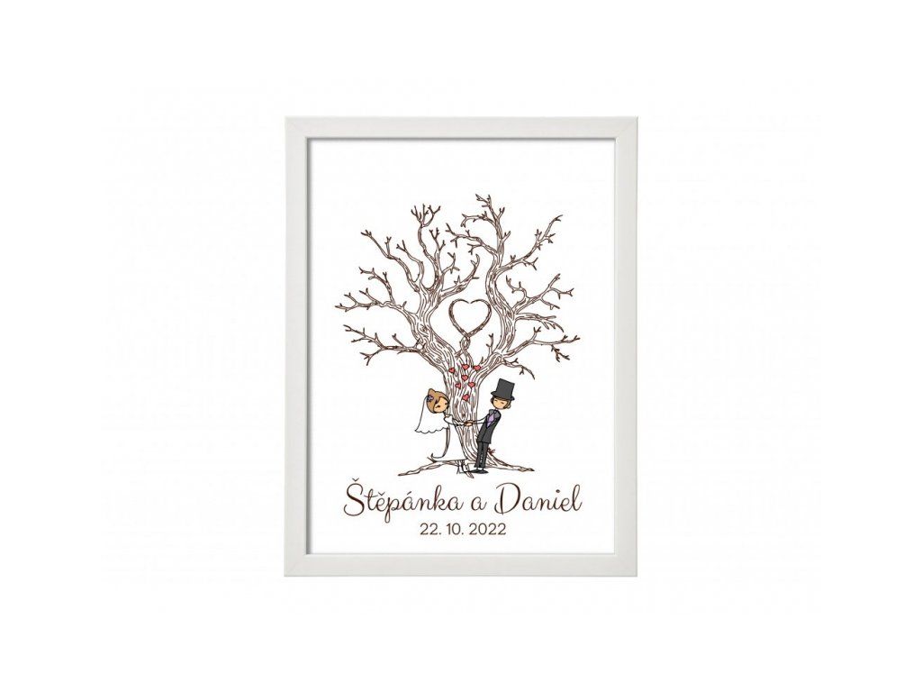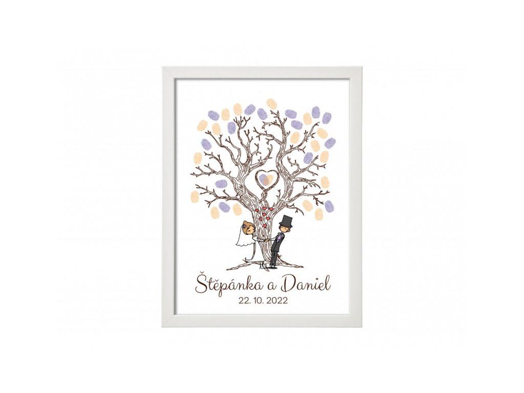 Svatební strom v s kreslený párem je určený k natisknutí otisků hostů s podpisem. Strom je dodávaný v bílém rámu a je určen pro 30 - 60 otisků prstů, záleží na velikosti obrazu.