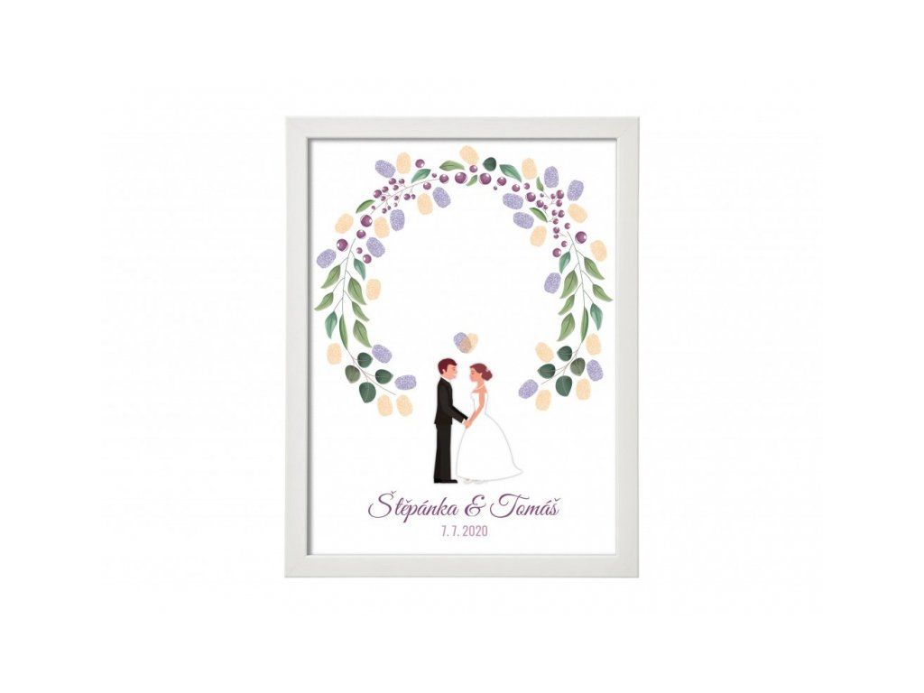 Svatební "strom" v s motivem páru a věnce určený k natisknutí otisků hostů s podpisem. Strom je dodávaný v bílém rámu a je určen pro 30 - 60 otisků prstů, záleží na velikosti obrazu.