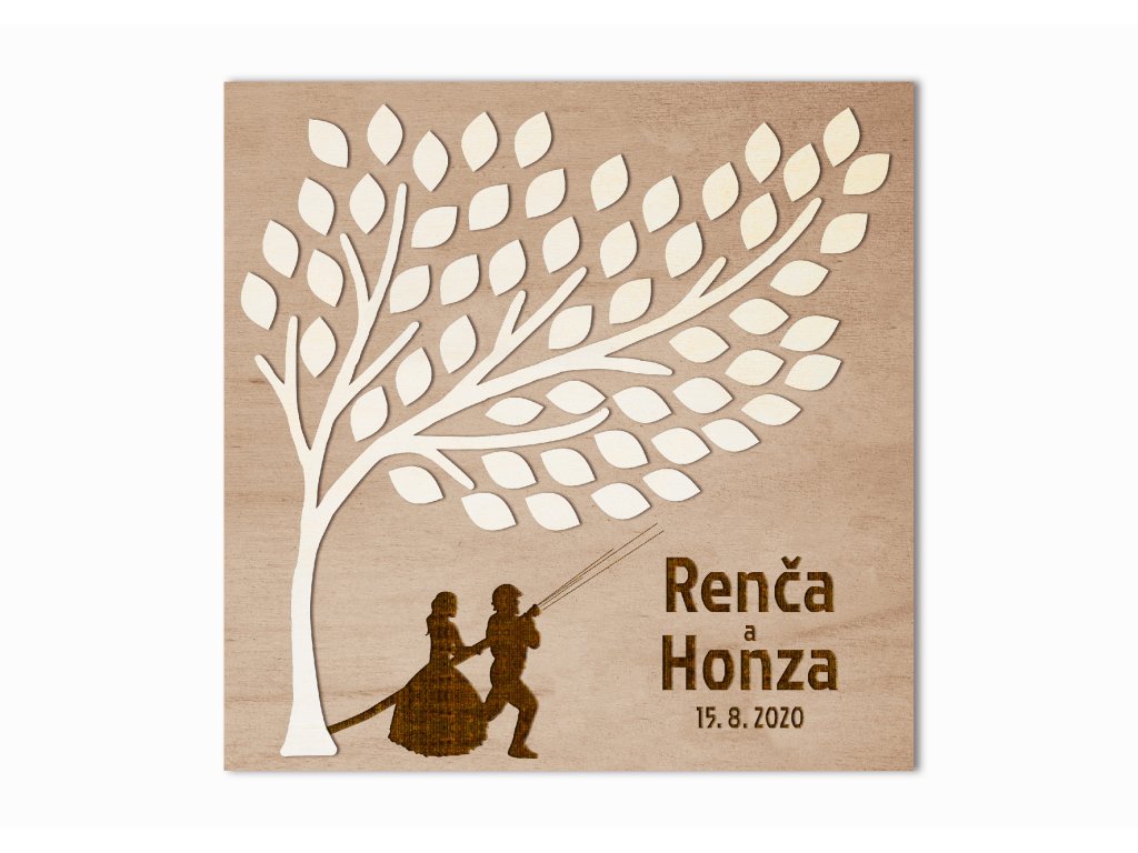 Tento svatební strom hostů s hasičským je krásným a originálním způsobem, jak zapojit hosty do vašeho svatebního dne. Každý host může do jednoho z lístků vepsat své jméno, vzkaz nebo přání a společně tak vytvoříte jedinečný obraz plný vzpomínek. Romantická silueta novomanželů dodává celé ceduli pohádkový a slavnostní nádech.