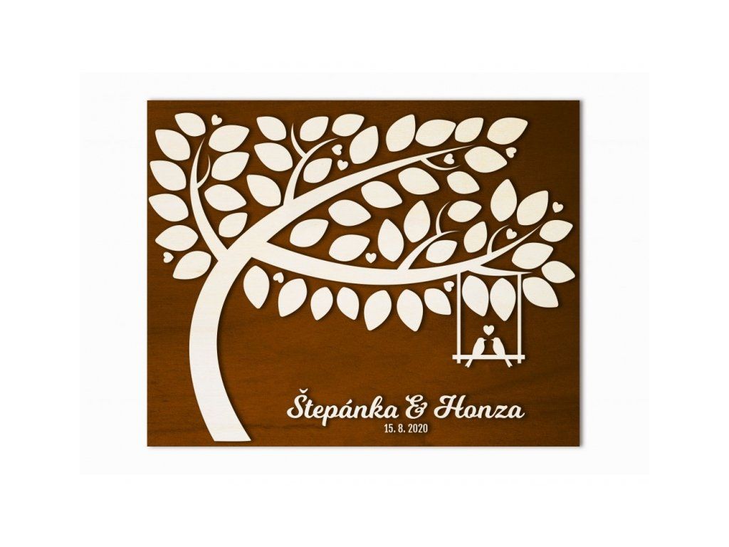 Přírodní svatební strom s podkladem tmavého dřeva. Na podkladu jsou umístěna jména ženicha a nevěsty a datum svatby pod stromem. Strom obsahuje celkem 50 lístečků.