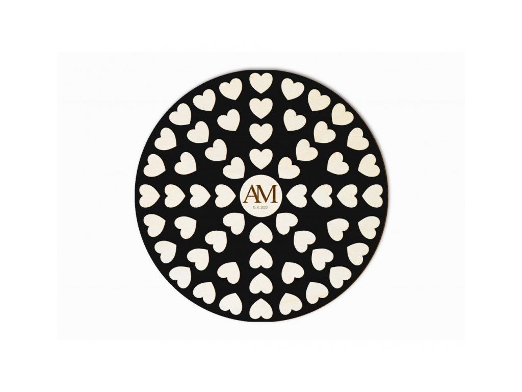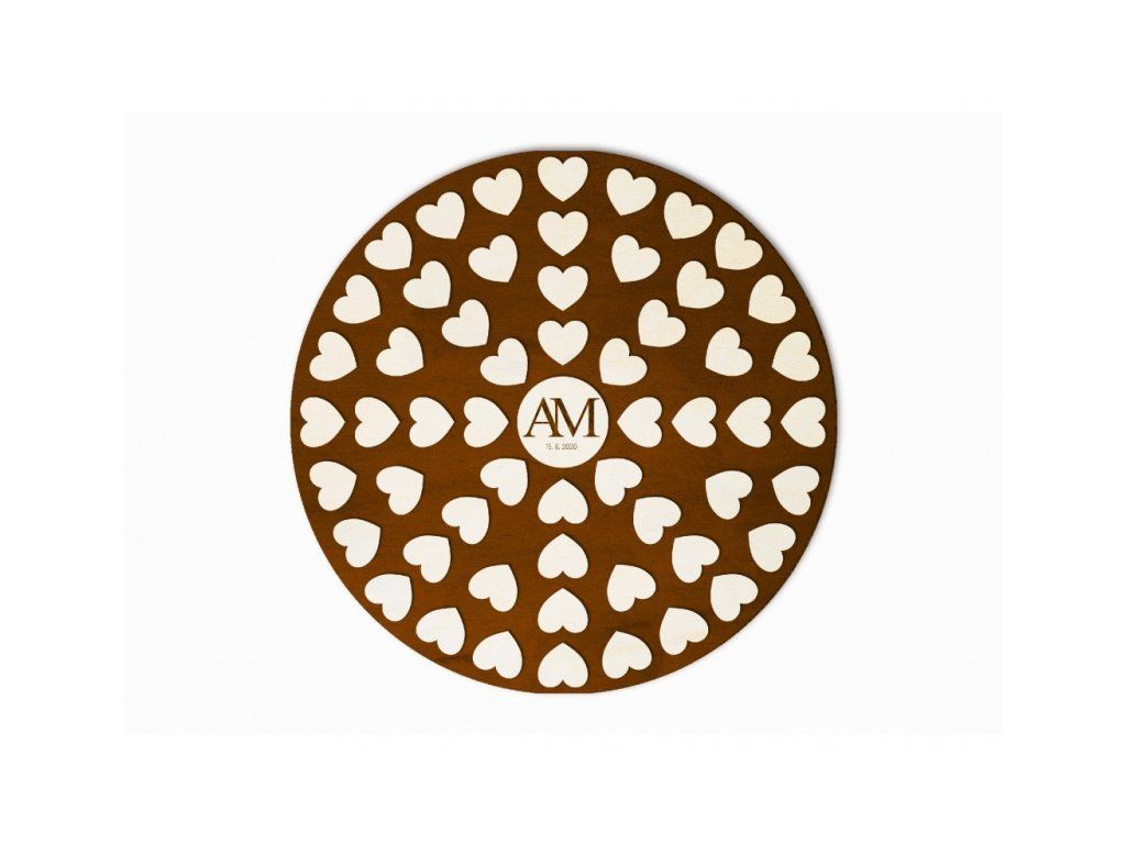 Svatební strom v netradičním provedením s podkladem v různých barvách dle vašeho výběru. Ve středu kruhu je místo pro vaše iniciály a datum svatby a srdce jsou určena pro podpisy hostů.