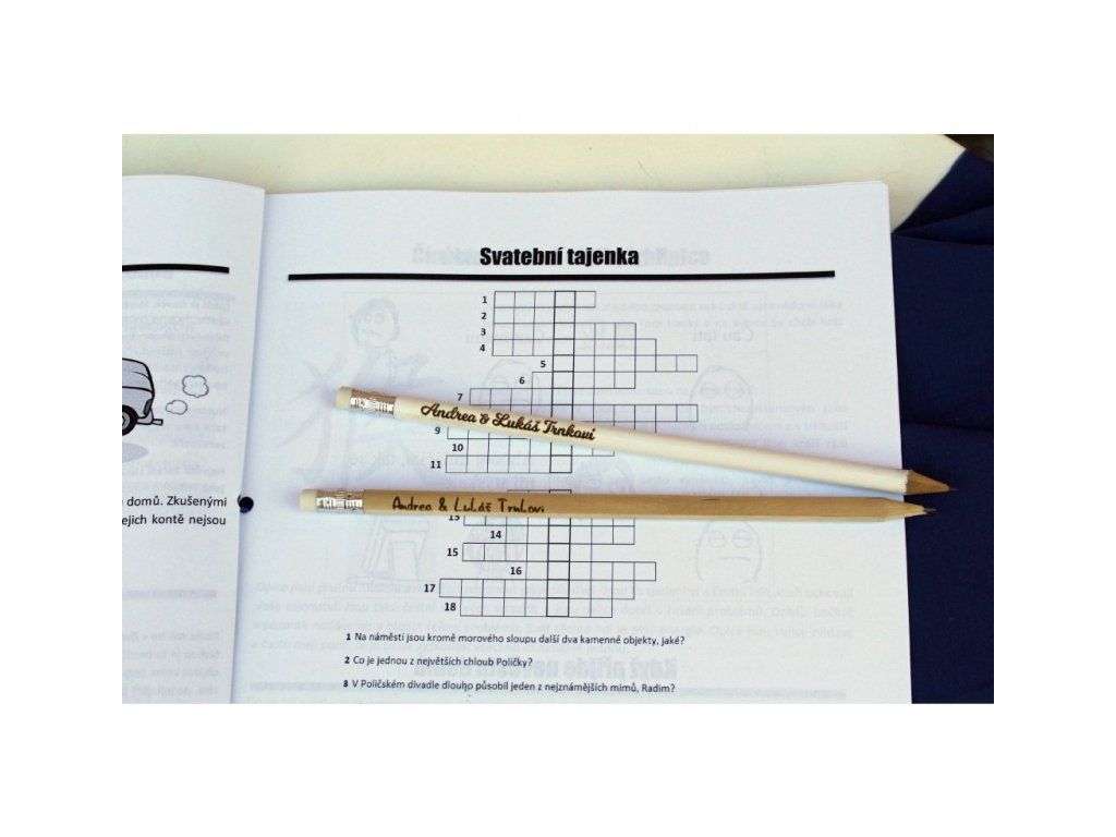 Ke svatbám neodmyslitelně patří i svatební noviny, které se často neobejdou bez nějaké křížovky či hlavolamu. Pořiďte si svatební tužky, které svatebčané na svatbě využijí a mohou si je odnést i jako malý dárek. Dřevěné tužky jsou obyčejné grafitové. Vybírejte z přírodní nebo bílé varianty. Na fotografii s fonty písma vyberte variantu, která se Vám líbí nejvíce, tu připište společně s textem a datem do kolonek nad tlačítkem koupit.Buďte první, kdo napíše příspěvek k této položce.