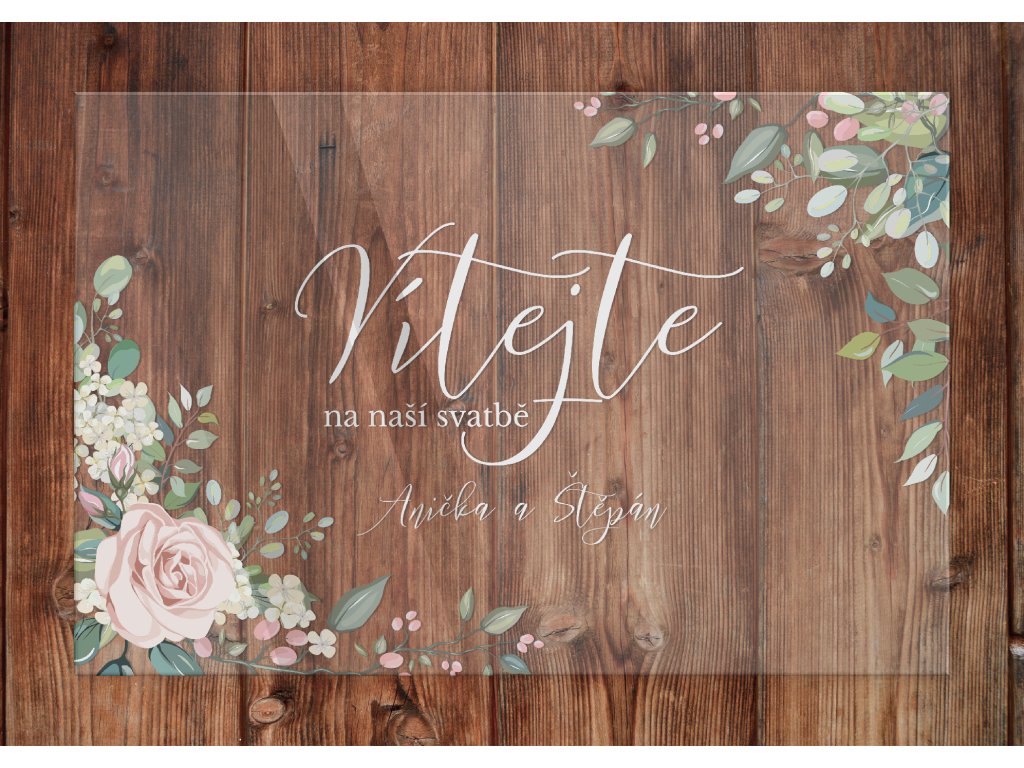 Svatební uvítací cedule na plexiskle – Růže a listy