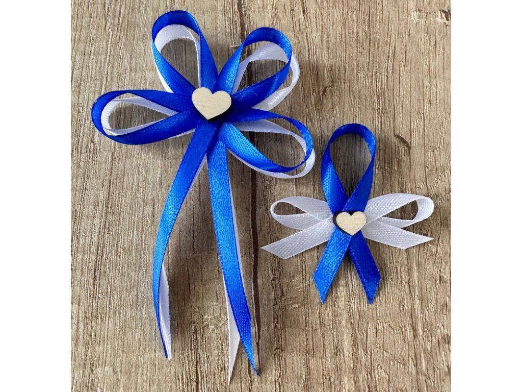 Saténové vývazky se špendlíkem, ve stejném designu jak pro hosty (menší 5x4 cm) tak pro svědky a rodiče (větší 7x6 cm).