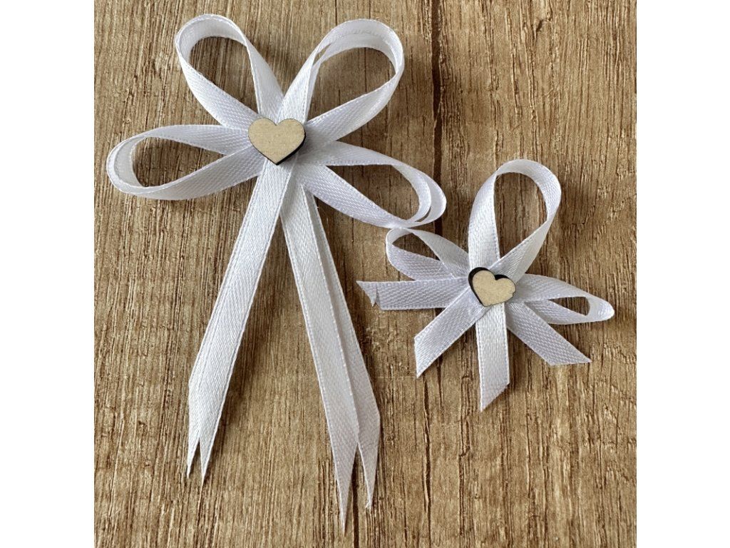 Saténové vývazky se špendlíkem, ve stejném designu jak pro hosty (menší 5x4 cm) tak pro svědky a rodiče (větší 7x6 cm).