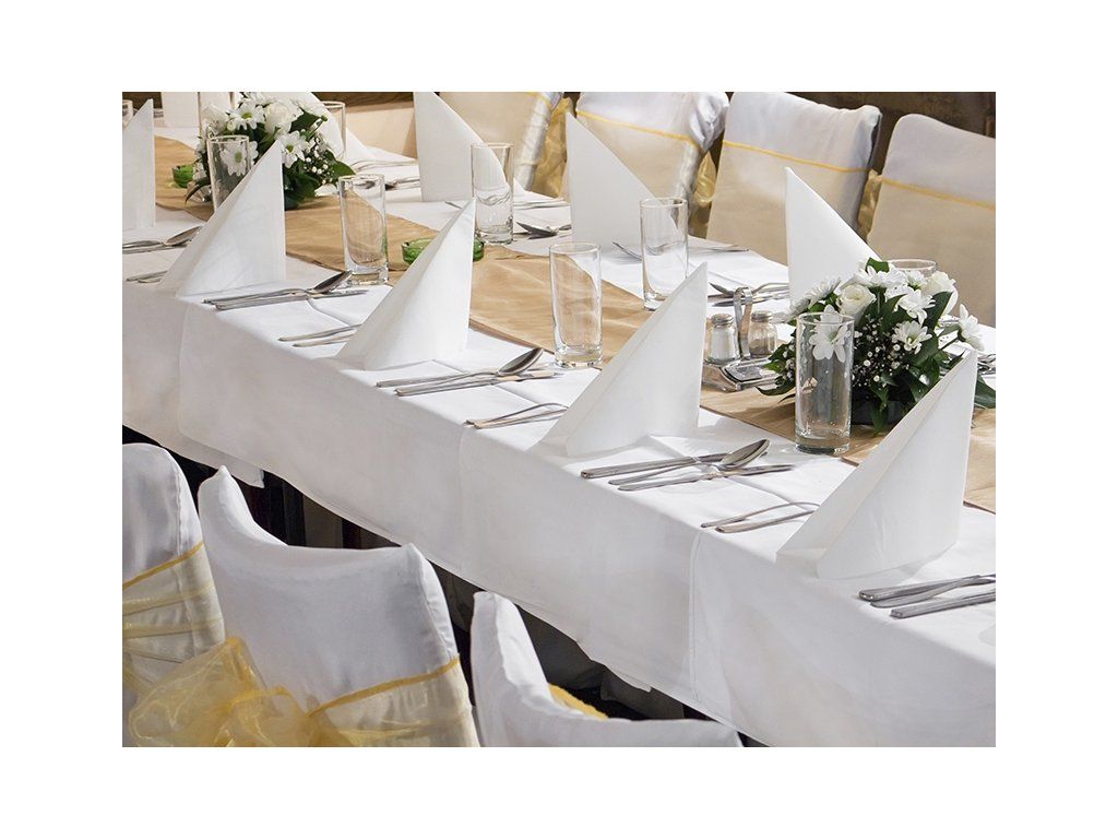 Hranatý bílý ubrus z matné látky, skvrněodolný. Vybírat můžete ze 2 rozměrů.