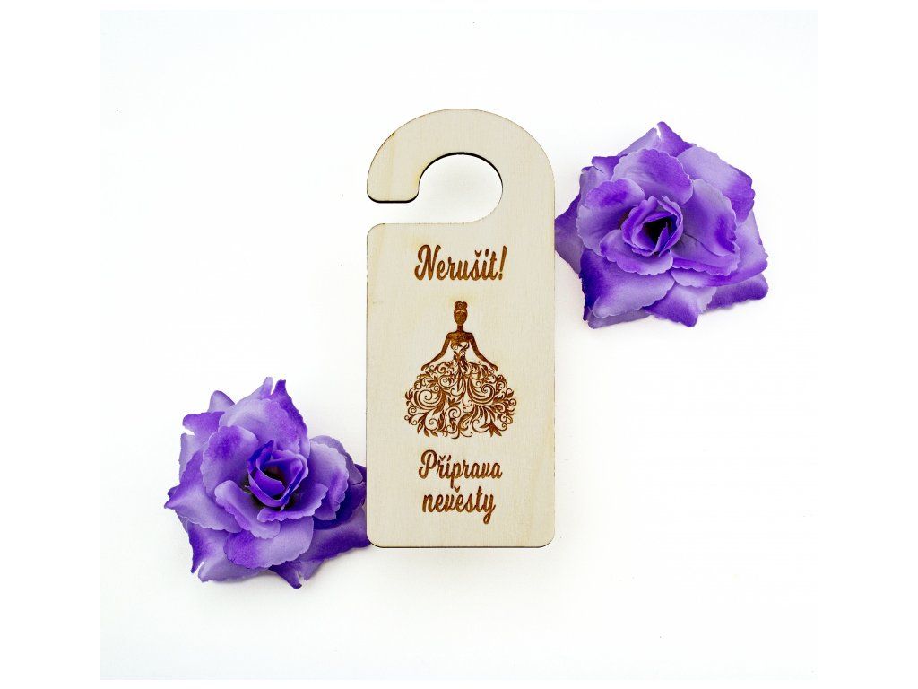 Nerušit - příprava nevěsty. Originální visačka na kliku pro nevěstu. Vyrobeno na topolovém dřevě. Rozměr visačky je 21x9 cm. Jedná se o poctivý český výrobek.