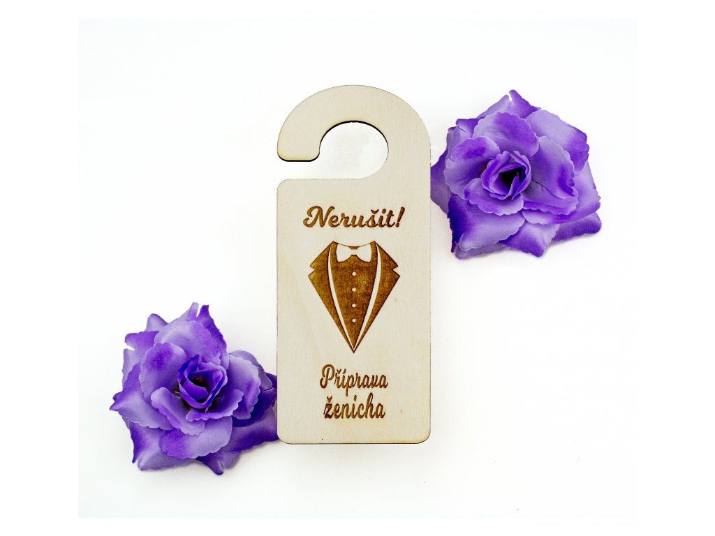 Nerušit - příprava ženicha. Originální visačka na kliku pro ženicha. Vyrobeno na topolovém dřevě. Rozměr visačky je 21x9 cm. Jedná se o poctivý český výrobek.