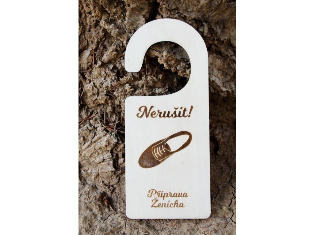 Nerušit - příprava ženicha. Originální visačka na kliku pro ženicha. Vyrobeno na topolovém dřevě. Rozměr visačky je 21x9 cm. Jedná se o poctivý český výrobek.