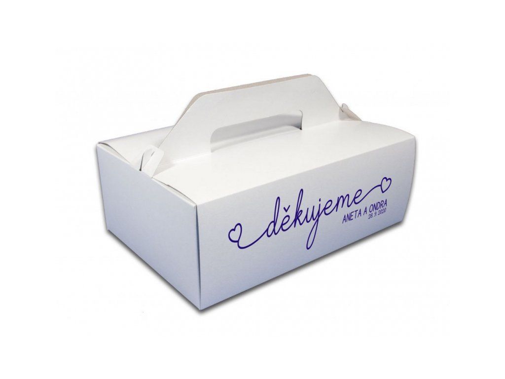 Bílá svatební krabička na výslužku s potiskem „děkujeme“, jmény a datem svatby je krásným a osobním detailem pro vaše hosty. Text na krabičce lze upravit přesně podle vašeho přání – změnit nápis, jména i datum. Díky pevné konstrukci bez problémů pojme dostatečné množství cukroví. Ideální kombinace elegance, praktičnosti a personalizace.Buďte první, kdo napíše příspěvek k této položce.