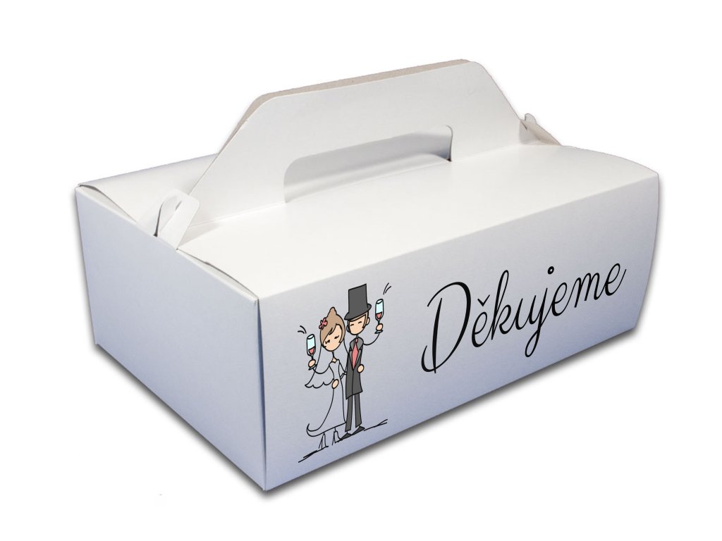Praktická a zároveň krásná krabička na svatební výslužky, která potěší každého hosta. Díky pevnému provedení a pohodlnému uchu se skvěle hodí na zákusky, koláčky i drobné dárky. Personalizovaný potisk dodá krabičce jedinečný vzhled a podtrhne atmosféru vašeho svatebního dne.